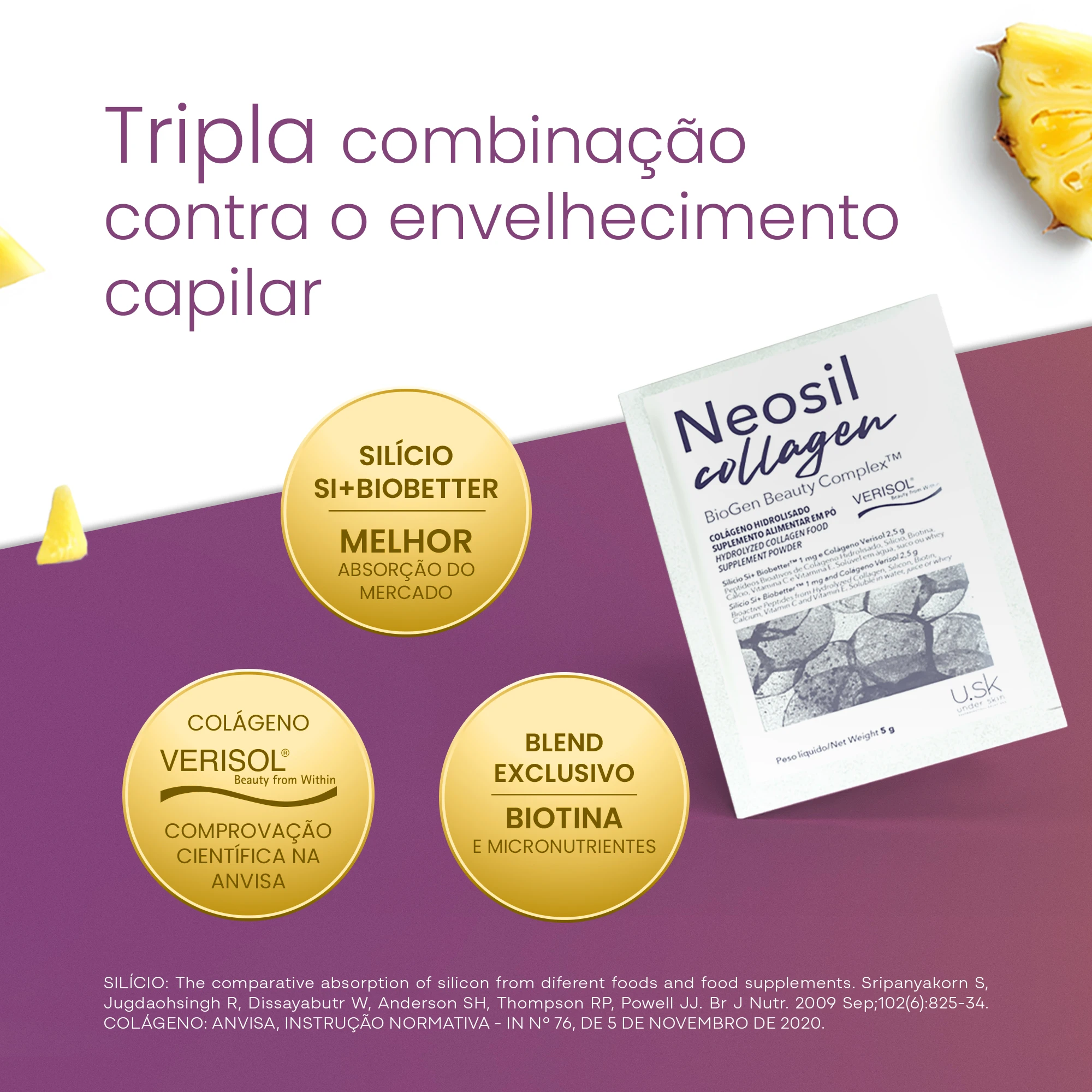 Indicação: Suplemento alimentar em pó com substâncias bioativas, vitaminas e mineral que pode ser usado para auxiliar na prevenção do envelhecimento capilar e na pele do couro cabeludo. NEOSIL É A MARCA ESPECIALISTA EM SAÚDE CAPILAR.