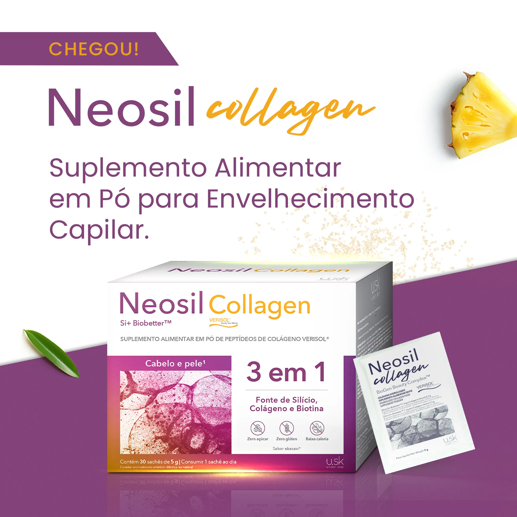 Neosil Collagen é um suplemento alimentar em pó com 1mg de silício Si+ Biobetter, molécula exclusiva e patenteada U.SK, que auxilia no combate à queda de cabelos, além de auxiliar na melhora da pele e das unhas; 2,5g de Colágeno VERISOL para estimular a produção natural de colágeno pelo organismo, melhorando a qualidade da derme do couro cabeludo e aumentando a espessura do fio; além de 38mcg de Biotina que ajuda a estimular a produção de queratina. Neosil Collagen também contém Vitamina E, Vitamina C e Cálcio.